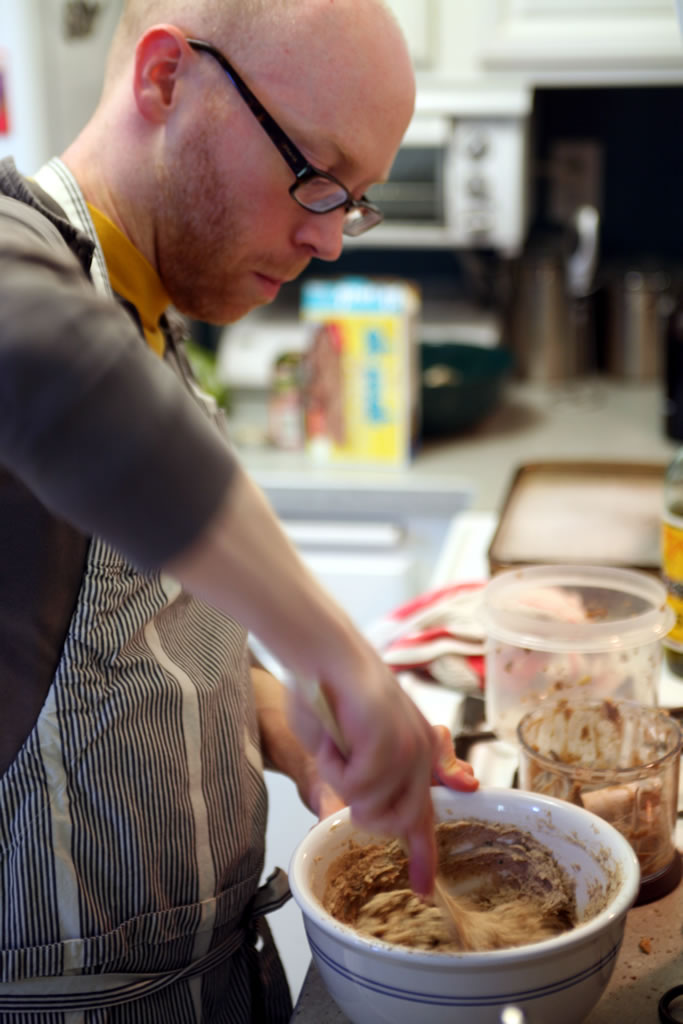 You’ll need to do this in a few stages since the blades can only handle so much at a time. I started off with just olive oil as I blended, but realized the texture was still a bit dry and stiff. Andrew suggested water; about a teaspoon added to each batch as you puree should give you the right consistency. Next I clipped some fresh rosemary from the garden and chopped it up finely. I used my trusty garlic press to mix in two medium-sized cloves and went to the spice rack for celery seed and ground coriander (and a last minute surprise addition of some cardamom). Of course I was generous with the salt and pepper, not just to bring out the flavors but also because I just can’t stop using our new grinders. We now have a handsome pair of Peugeot salt and pepper mills, from our friends at Sur la Table, and they’re as fun to use as they are pleasing to the eyes. They’re not cheap, but the grinding mechanism comes with a lifetime guarantee. Really. Till death do you part.